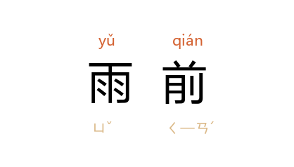引宋 苏轼 《留题显圣寺》诗:“浮石 已乾霜后水, 焦坑 闲试雨前茶。”《宋史·食货志下五》:“散茶出 淮南、归州、江南、荆湖,有龙溪、雨前、雨后之类十一等。”清 孙枝蔚 《思归》诗:“忍渴 潜江 今两月, 扬州 痛喫雨前茶。”