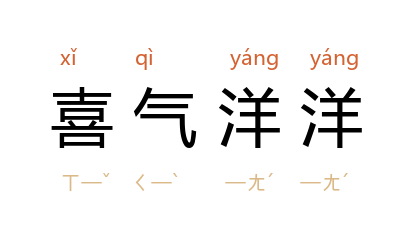 引《水浒传·第一三回》:「杨志喜气洋洋,下了马,便向厅前来拜谢恩相,充其职役。」《二刻拍案惊奇·卷二〇》:「后来知县朝觐去了,巢大郎已知陈定官司问结,放胆大了,喜气洋洋,转到家里。」