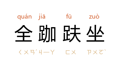 ⒈ 佛教用语。佛徒跏趺坐法中,交叉两足并分置两膝上称全跏趺坐。参见“跏趺”。
