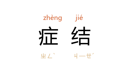 例如:「事情症结」、「症结出现时,大家须捐弃成见,共谋解决办法。」