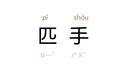 引《金瓶梅词话》第一回:“武松 匹手夺过来,泼在地下。”《金瓶梅词话》第七二回:“秋菊 问他要棒槌使使,他不与,把棒槌匹手夺下了,説道:‘前日拿了个去不见了,又来要。’”