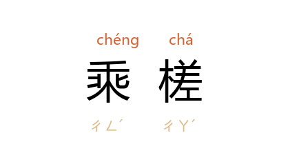 ⒉ 乘坐竹、木筏。传说天河与海通,有人居海渚者,年年八月见有浮槎去来,不失期,遂立飞阁于查上,乘槎浮海而至天河,遇织女、牵牛。此人问此是何处,答曰:“君还至蜀郡访严君平则知之。”后至蜀,君平曰:“某年月日有客星犯牵牛宿。”正是此人到天河时。见晋张华《博物志》卷十。《艺文类聚》卷八引“查”作“楂”。南朝梁宗懔《荆楚岁时记》也载有类似的传说:汉张骞奉命出使西域等河源,乘槎经月,到一城市,见有一女在室内织布,又见一男子牵牛饮河,后带回织女送给他的支机石。北周庾信《哀江南赋序》:“况复舟楫路穷,星汉非乘槎可上;风飙道阻,蓬莱无可到之期。”宋苏轼《次韵正辅同游白水山》:“岂知乘槎天女侧,独倚云机看织纱。”清孔尚任《岸桴记》:“予乘槎三年,江淮湖海,住若里巷。”后用以比喻奉使。