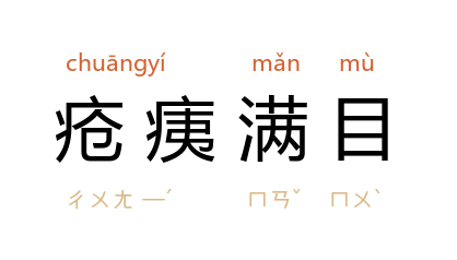 亦作“疮痍弥目”。 李大钊 《大哀篇》:“復丁干戈大乱之后,满地兵燹,疮痍弥目,民生凋敝,亦云极矣。”