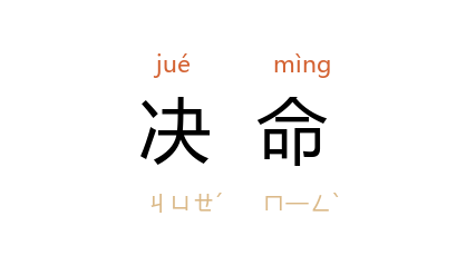 引《孙武兵法佚文》:“鼓呼而衝,进而勿顾,决命争强,死而须鬭。”《南史·张彪传》:“杨 投井决命。”唐 颜真卿 《天下放生池碑铭序》:“功庸格天地,孝感通神明……扶服万里,决命而争先。”《新唐书·陆贽传》:“交锋原野之上,决命寻常之间。”