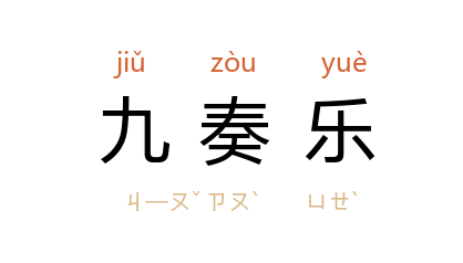⒈ 由九支乐曲组成的宫廷宴会音乐。按,《明史·乐志三》云,“九奏乐”谓一奏炎精开运之曲,二奏皇风之曲,三奏眷皇明之曲,四奏天道传之曲,五奏振皇纲之曲,六奏金陵之曲,七奏长杨之曲,八奏芳醴之曲,九奏驾六龙之曲。