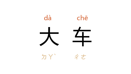 ⒊ 《诗经·王风》的篇名。共三章。根据〈诗序〉:「大车,刺周大夫也。」或亦指女子有所爱慕而不得遂其志之诗。首章二句为:「大车槛槛,毳衣如菼。」
