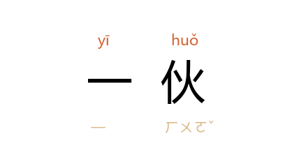 例如:「他们一伙又来了。」、「这一伙盗匪杀人放火,打家劫舍,无恶不作。」