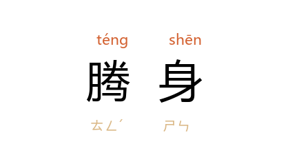 引《初刻拍案惊奇》卷四:“女子腾身飞出官城,数十里乃下。”太平天囯 洪秀全 《述志》诗:“展爪似嫌云路小,腾身何怕汉程偏。”许地山 《女儿心》:“忽然跳出那个老和尚,抱着一张大被窝,腾身向火一扑,自己倒在火上压着。”