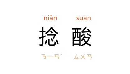 引明 汤显祖 《牡丹亭·围释》:“便许他在那里,你却也忒捻酸。”《初刻拍案惊奇》卷二六:“不觉捻酸起来,嚷道:‘得了些滋味,也该来商量个长便。’”《东周列国志》第五二回:“少不得 仪大夫 稀疏一二分,出了我这点捻酸的恶气。”