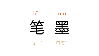 ⒋ 中国画技法和理论上的术语,有时亦作中国画技法的总称。技法上,笔指钩、勒、皴、点等笔法,墨指烘、染、破、积等墨法。