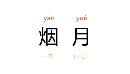 ⒈ 云雾笼罩的月亮;朦胧的月色。烟花风月。指风流韵事。