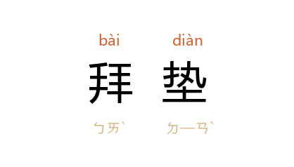 引《红楼梦》第五三回:“贾菖、贾菱 展拜垫,守焚池。”《二十年目睹之怪现状》第四三回:“地下设了拜垫,两旁点了两排寿烛,供了十多盆菊花。”巴金 《家》十五:“火盆前面另外铺上了一个大拜垫,上面再盖了一张绒毡。”