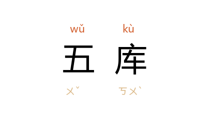 ⒈ 古代贮藏材料的五种仓库。指车库、兵库、祭器库、乐库和宴器库。见《初学记》卷二四引汉·蔡邕《月令章句》。