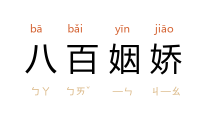 引《宣和遗事》前集:“甚言语?他是天子,有一皇后,三夫人,二十七世妇,八十一御妻,更有三千粉黛,八百烟(姻)娇。”元 无名氏 《抱妆盒》第二折:“管领他美孜孜八百姻娇,守定这艷亭亭三千粉黛。”元 马致远 《汉宫秋》第一折:“端的是卿眇目,他双瞎,便宣的八百姻娇比竝他,也未必强如俺娘娘带破赚(绽)丹青画。”