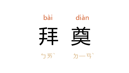 引《初刻拍案惊奇·卷二七》:「问到他墓下,拜奠了,就请旧日尼院中各众,在墓前建起水路道场。」《儒林外史·第四八回》:「即备了香楮三牲,到灵前去拜奠。」