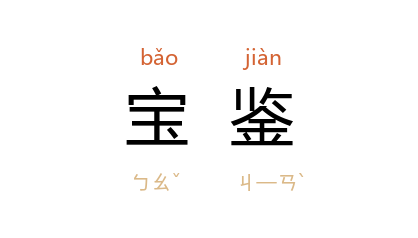 ⒈ 宝镜。镜子的美称,亦以喻月亮。常用作书名,取可以借鉴之意。如 唐 卫嵩 有《医门宝鉴》三卷, 元 夏文彦 有《图绘宝鉴》五卷。