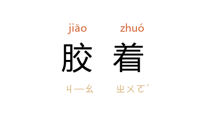 ⒊ 比喻相持不下或工作不能进行,犹如黏住。见“胶著”。