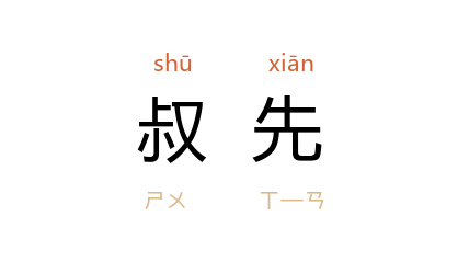 ⒈ 复姓。 汉 有 叔先雄。见《后汉书·列女传》。
