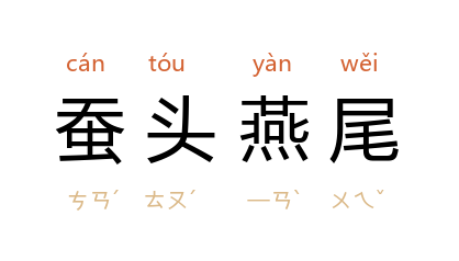 ⒈ 书法上称横划起笔如蚕首般凝重迟笨为「蚕头」;捺划收笔出锋处,提笔回锋如燕尾般轻倩分叉为「燕尾」。