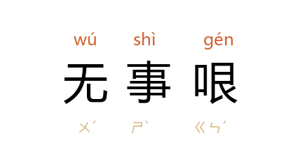 引元 无名氏 《冻苏秦》第四折:“我那时衣不遮身,今日箇駟马雕轮……全不想冰雪堂无事哏。”亦作“无事狠”。 元 郑廷玉 《后庭花》第一折:“你直恁的倚势挟权无事狠,脊梁上打到有五六轮。”