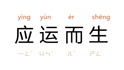 ⒈ 顺应天命或时势而降生。唐·王勃〈益州夫子庙碑〉:「大哉神圣,与时回薄,应运而生,继天而作。」也作「应运而起」、「应运而出」。
