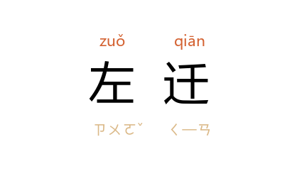 ⒈ 降职、贬官。古人尊右而卑左,故称官吏被贬降职为「左迁」。唐·白居易〈琵琶行·序〉:「元和十年,予左迁九江郡司马。」也作「左降」、「左转」。