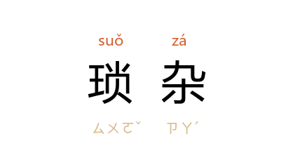 引唐 刘知几 《史通·补注》:“若 萧(萧大圜)羊(羊衒之 )之琐杂, 王(王劭)宋(宋孝王 )之鄙碎,言殊拣金,事比鷄肋,异体同病,焉可胜言。”清 刘大櫆 《胡氏贤母赞》:“娣姒妾媵之间,米盐琐杂,各私一己,靡不竞争。”