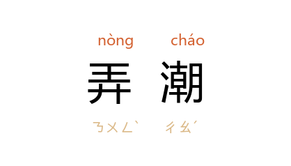 ⒈ 在潮水里游水作戏。以 钱塘 弄潮最著名。又 南宋 临安 风俗,八月观潮,少年百十为群,执旗泅水上,称弄潮之戏。参阅 宋 吴自牧 《梦粱录·观潮》。