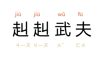 引《诗经·周南·兔罝》:「赳赳武夫,公侯好仇。」《二十年目睹之怪现状·第八三回》:「看不出这么一个赳赳武夫,倒是一个旖旎多情的男子!」