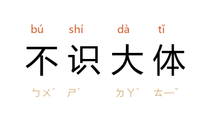 ⒈ 大体,指重要的道理。不识大体指缺少远见,只计较细节,而无法掌握最重要的道理。也作「不知大体」。