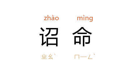 引《后汉书·张酺传》:“司徒 吕盖 奏 酺 位居三司,知公门有仪,不屏气鞠躬以须詔命,反作色大言,怨让使臣,不可以示四远。”晋 葛洪 《抱朴子·自叙》:“小子岂敢苟洁区区之懦志,而距弘通之大制,故遂息意而恭承詔命焉。”清 赵翼 《廿二史札记》卷四:“两 汉 詔命,皆由尚书出。”