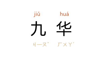 ⒈ 重九之花,指菊花。花朵繁茂。喻妇德昭彰。山名。在今安徽省·青阳县。旧称九子山。因有九峰如莲花,故改为今名。宫殿名。