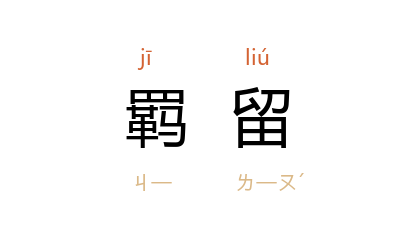 ⒈ 拘禁、看守。宋·胡铨〈戊午上高宗封事〉:「羁留虏使,责以无礼。」也作「羇留」。