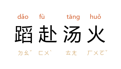 ⒈ 比喻不避艰险。也作「赴汤蹈火」。