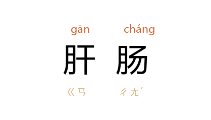 ⒈ 肝和肠。多与其他词连用比喻人的某种心绪。如肝肠寸断;肝肠如焚。
