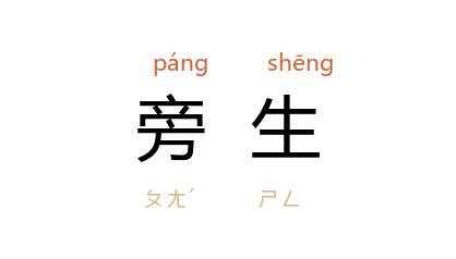 ⒈ 广生。旁边生长。佛教语。指畜生。谓兽畜昆虫,皆是业轮恶趣,非人天之正道,故称。一说,畜生横行,故曰旁生。