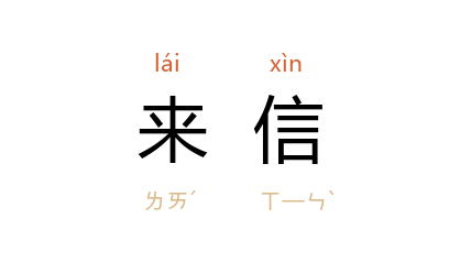 ⒈ 寄来或送来的信。南朝晋·陆云〈南衡〉诗五首之三:「我之怀矣,有客来信。」也作「来函」、「来鸿」、「来简」、「来札」、「来书」。