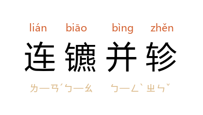 ⒈ 镳,马口所含的铁环,亦用以指马。轸,车后横木,亦为车子的通称。连镳并轸比喻并驾齐驱。