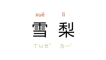 ⒈ 植物名。蔷薇科棠梨属。树高六至十二公尺,叶呈长椭圆形,边缘锯齿状。果实亦称 为「雪梨」,球形,因肉质细嫩,色白如雪而得名。