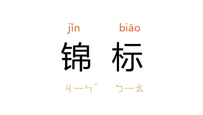 ⒈ 本指以锦缎制成的标旗。唐·白居易〈和春深〉诗二〇首之一五:「齐桡争渡处,一匹锦标斜。」后泛称比赛获胜的奖品。宋·杨万里〈过弋阳观竞渡〉诗:「银碗锦标夸胜捷,画桡绣臂照江湖。」