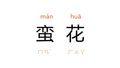 引唐 李商隐 《和孙朴韦蟾孔雀咏》:“瘴气笼飞远,蛮花向坐低。”宋 王安石 《溯栰》诗:“野果寒林寂,蛮花午簟温。”明 徐渭 《扶桑花》诗之一:“忆别 汤江 五十霜,蛮花长忆烂扶桑。”清 唐孙华 《戏为友人代忆》诗之二:“蛋户惊妆靨,蛮花照泪痕。”