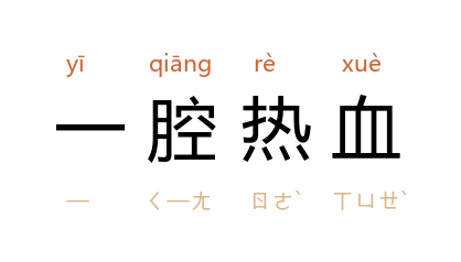 引元·无名氏《争报恩·第三折》:「舍一腔热血,答救千娇姐姐。」清·孔尚任《桃花扇·第九出》:「不意奸人忌功,才用即休,叫俺一腔热血,报主无期,好不恨也!」