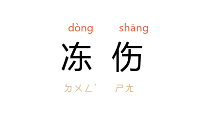 ⒈ 病名。皮肤组织因温度过低所引起的伤害。轻微冻伤使皮肤红肿、灼痛或发痒,重则起水泡,甚至皮肤坏死。
