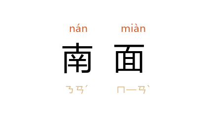 ⒈ 古代以坐北朝南为尊位,故帝王诸侯见群臣,或卿大夫见僚属,皆面向南而坐,因用以指居帝王或诸侯、卿大夫之位。参阅 清 王引之 《经义述闻·通说上·南面》。