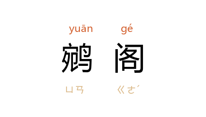 引唐 王勃 《上明员外启》:“麟图缉諡,定荣辱於三泉;鵷阁裁书,考薰蕕於四部。”旧题 宋 尤袤 《全唐诗话·徐彦伯》:“徐彦伯 为文,多变易求新,以凤阁为鵷阁,龙门为虬户。”清 周亮工 《寿青溪三老序》:“君今齿方壮,自兹以往,宜其遐福兰臺鵷阁,玉璽金钩。”