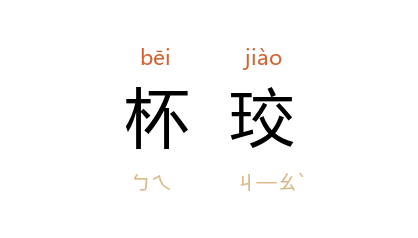 ⒈ 在神明前占卜吉凶的器具。原用蚌壳投掷于地,视其俯仰情形,断其吉凶。后改用竹子或木片,做成蚌壳状替代。唐·韩愈〈谒衡岳庙遂宿岳寺题门楼〉诗:「手持杯珓导我掷,云此最吉余难同。」也作「杯筊」、「杯校」、「杯教」、「碑珓」、「筊杯」、「珓杯」、「珓儿」。