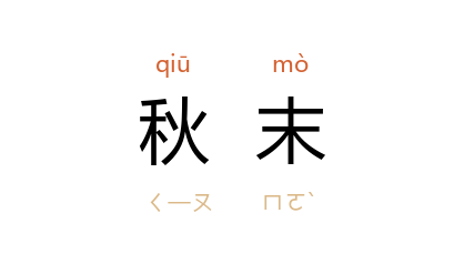 引《太平御览》卷二五引 南朝 梁元帝 《纂要》:“九月季秋亦曰暮秋、秋末、暮商、季商、杪秋。”《南齐书·周颙传》:“文惠太子 问 顒 :‘菜食何味最胜?’ 顒 曰:‘春初早韭,秋末晚菘。’”《宋史·外国传四·交阯》:“去岁秋末抵 交州 境, 桓 遣牙内都指挥使 丁承正 等以船九艘、卒三百人至 太平军 来迎。”