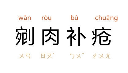 ⒈ 后因以“剜肉补疮”或“剜肉医疮”比喻用有害的手段救眼前之急,不暇顾及后果。