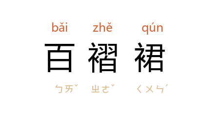 引清 汤春生 《夏闺晚景琐说》:“次解淡墨百褶裙,下曳皂色紈裤。”陈毅 《昆明游西山》诗:“红头巾,百褶裙,緑坎肩。人欢欣,更健美,鄙神仙。”张长 《空谷兰》:“激流冲击着她的脚,那藏青色的百摺裙几乎湿透了。”