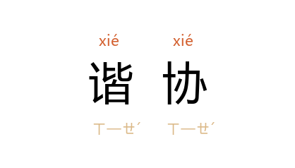 引宋 沉辽 《德相送荆公三诗用元韵戏为之》:“簫竽合古律,宫羽自谐协。”明 李东阳 《麓堂诗话》:“诗有纯用平侧字而自相谐协者。”夏丏尊 叶圣陶 《文心》八:“诗的所以为诗,全在有浓厚紧张的情感,次之是谐协的韵律,并不在乎词藻的修饰。”